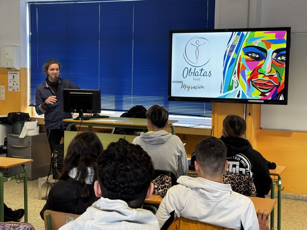 Roberto, traballador de Oblatas, tivo un encontro coas clases de 3º e 4º de ESO para contarlles, respectivamente, a súa experiencia con mulleres que sofren discriminación de xénero e con persoas que viven a realidade da inmigración.